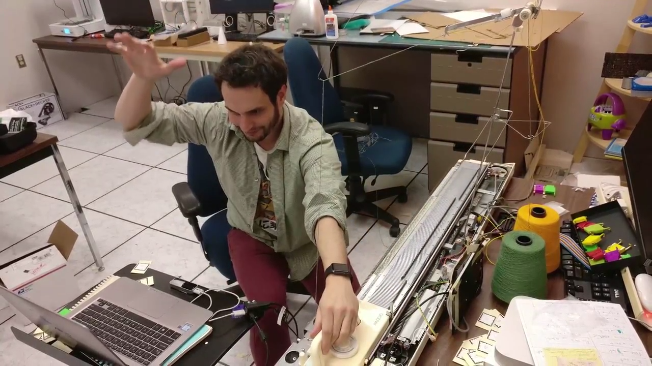 **Playing BeatKnit. A player runs the carriage back and forth to play the desired rhythm. Meanwhile the player uses their other hand to play a Therimin instrument.**