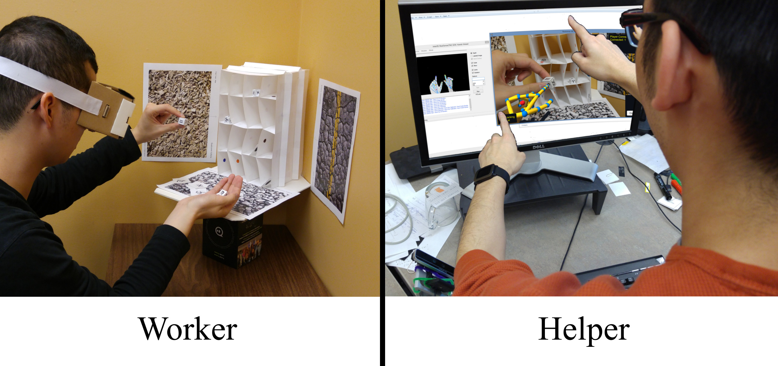 **The same schematic in real life. The helper uses hand gestures (appearing as virtual hands) which are then replicated and overlaid in the Worker's display. The AR tags in the scene help ground the to the world as opposed to a traditional drawn-on-screen annotation.**