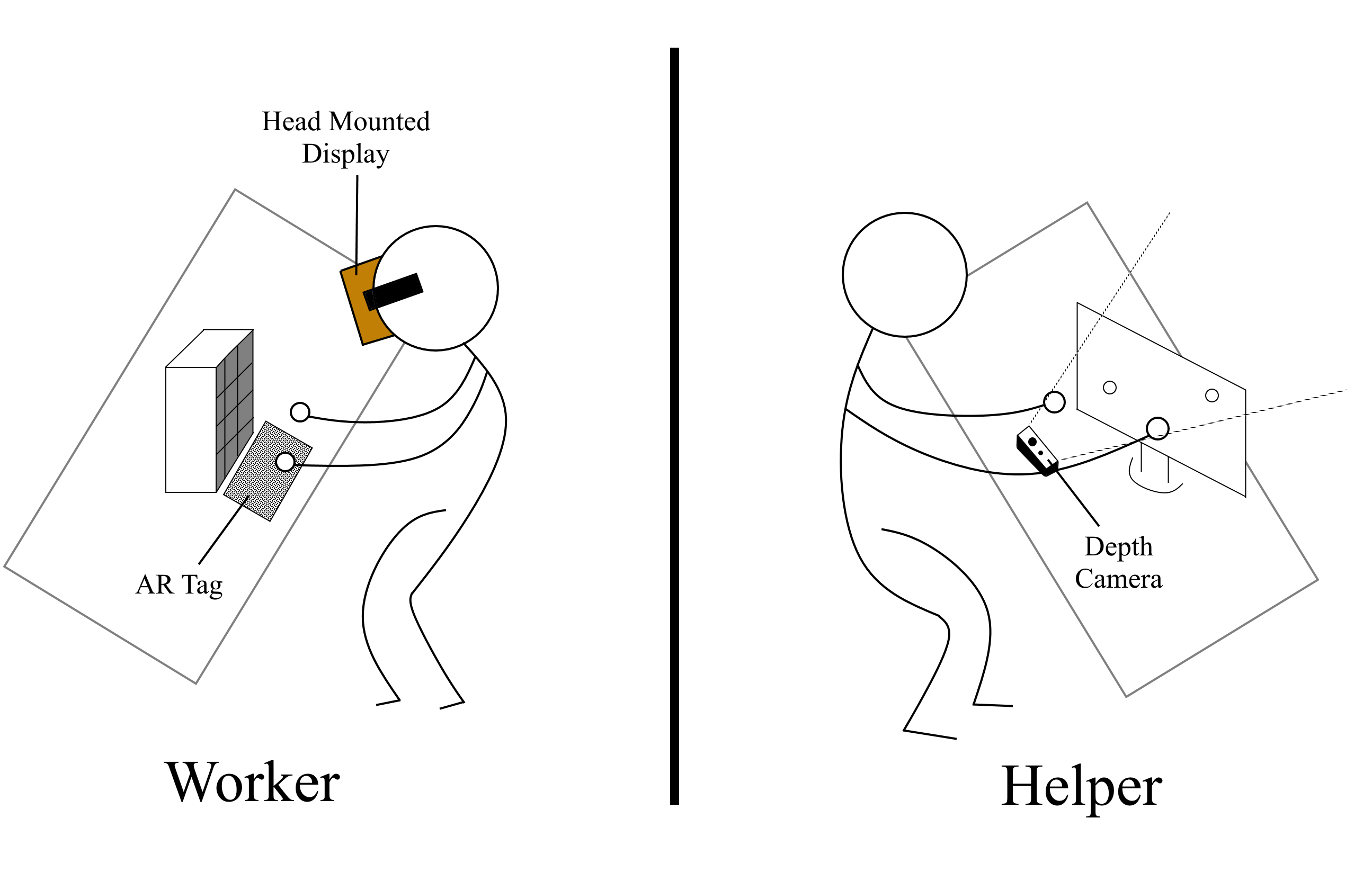 **A schematic of the remote collaboration scenario. A worker (left) is requesting assistance from a helper (right). A worker uses a Head Mounted Display (Google Cardboard) and a Depth Camera (Intel RealSense). They both work together on the worker's problem object. An AR tag is used to localize the hands to the environment.**